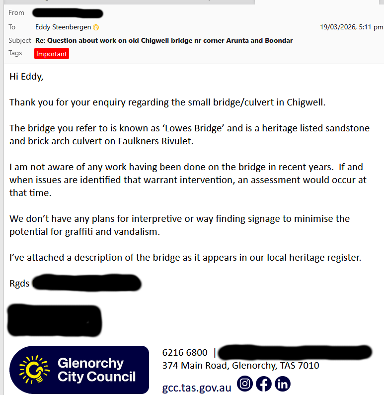 4. Council email response to questions about Lowes Bridge received 19 March 2026.